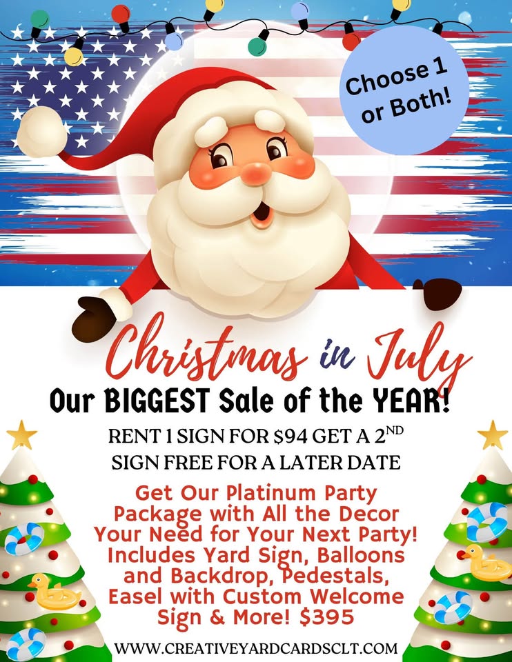 Its Christmas in July at Creative Yard Cards Charlotte! Take advantage of our BOGO yard signs while they last! No coupon needed. Add 2 Premium signs to your cart and only pay for 1 at checkout.